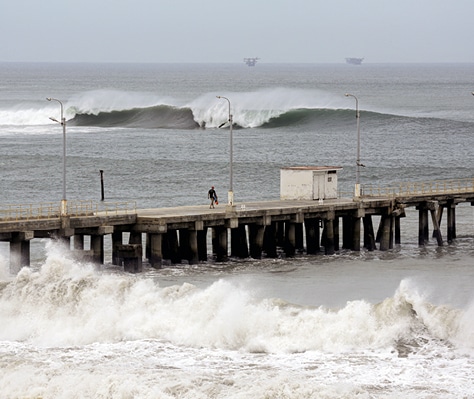 Onde La costa dell’Ecuador, del Perù e del Cile è stata investita da onde alte fino a quattro metri (nella foto), che hanno provocato la chiusura di decine di porti e la morte di almeno tre persone. Il fenomeno sarebbe dovuto ai forti venti che hanno soffiato per giorni al largo della costa occidentale degli Stati Uniti.