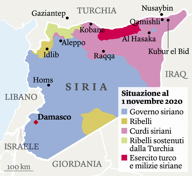 u Dopo lo scoppio della guerra civile siriana nel marzo del 2011, nel 2012 i curdi siriani costituiscono l’Amministrazione autonoma del nordest della Siria, conosciuta come Rojava, che si propone come un nuovo progetto politico basato su un sistema democratico, pluralistico, multietnico, sull’uguaglianza di genere, economica e culturale e sul rispetto dell’ambiente. u Tra il settembre 2014 e il marzo 2015 i combattenti curdi delle Unità di protezione del popolo (Ypg) respingono i jihadisti del gruppo Stato islamico (Is) da Kobane. Con il sostegno degli Stati Uniti, i curdi combattono contro l’Is nel nord della Siria, fino alla liberazione di Raqqa (l’autoproclamata capitale dei jihadisti), nell’ottobre del 2017 e alla sconfitta del gruppo nel marzo del 2019. u Nell’ottobre del 2019 il presidente degli Stati Uniti Donald Trump annuncia il ritiro delle truppe americane dal nord della Siria e la Turchia lancia un’offensiva per cacciare le forze curde dal territorio lungo il confine. Sentendosi abbandonati, i curdi concludono un accordo con il governo siriano per ricevere sostegno militare contro i turchi. La Turchia e la Russia (alleata di Damasco) si accordano per condurre dei pattugliamenti congiunti nel nordest della Siria, mentre gli Stati Uniti mantengono un contingente nella zona.