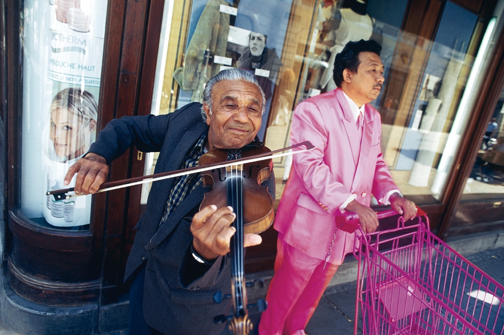 A un certo punto Manit Sriwanichpoom decise di portare Pink man fuori da Bangkok. Prima viaggiando nel paese: nella serie intitolata Amazing Thailand prende in prestito uno slogan del governo per criticare il turismo di massa. Vediamo Pink man sempre impassibile e volgare nel suo abbigliamento. Ci sembra ridicolo quando passa con il suo carrello in mezzo a una risaia subito dopo il raccolto, o posa nel cortile di un tempio accanto a sculture da quattro soldi. Poi, nel 2000, lo vediamo in Europa. E qui non mancano gli stereotipi: dalle gondole di Venezia ai violinisti gitani in Austria, passando per l’architettura metallica della stazione di Copenaghen e i suoi gelati. Un’Europa vista e consumata da un borghese tailandese.