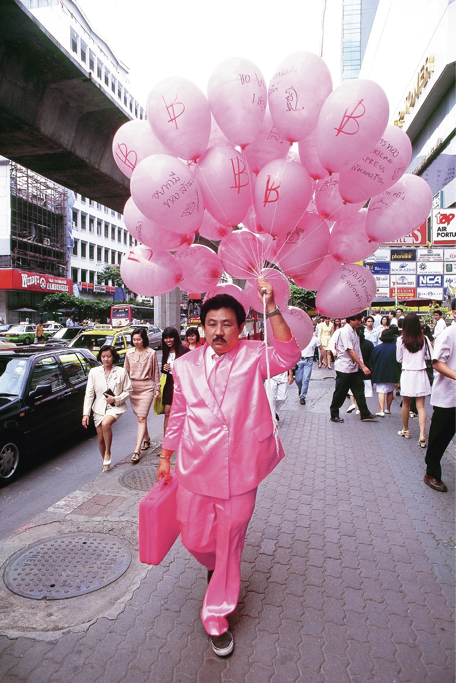La prima serie è stata realizzata per le strade di Bangkok. Pink man spinge il suo carrello ancora vuoto in giro per il quartiere finanziario e per l’animata Si Lom road, con il suo mercato di Lalai Sap (“far scomparire il denaro” in tailandese), e i suoi ristoranti molto frequentati all’ora di pranzo dagli impiegati. Poi posa vicino al clown del McDonald’s, che sembra un’aberrazione in una città in cui lo street food è ovunque e a qualsiasi ora del giorno. In altre immagini attraversa la folla con in mano una lampada a petrolio e una valigetta, o un enorme grappolo di palloncini. Ovviamente tutto rosa.