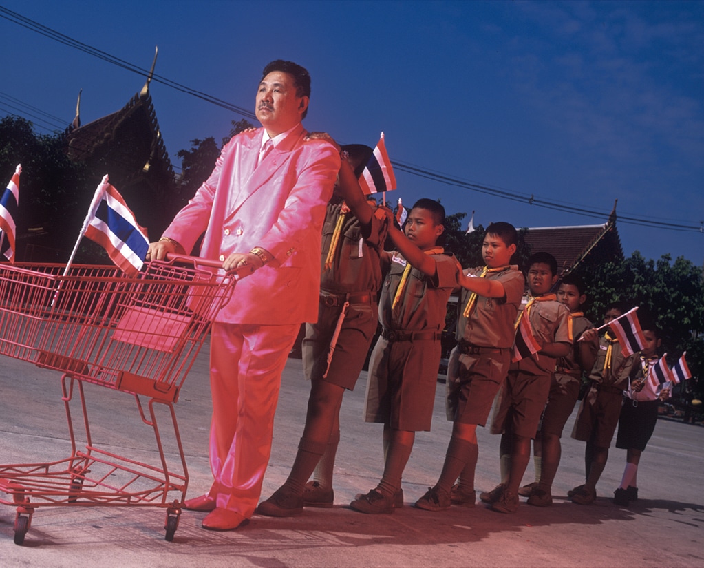 Molti lavori dell’artista prendono di mira il nazionalismo. Nella serie Pink, white & blue, che in Thailandia non gli hanno permesso di esporre, Pink man abbraccia la bandiera tailandese e la fa portare a dei bambini scout. Lo sguardo del fotografo è sempre pungente e Pink man non sorride mai.