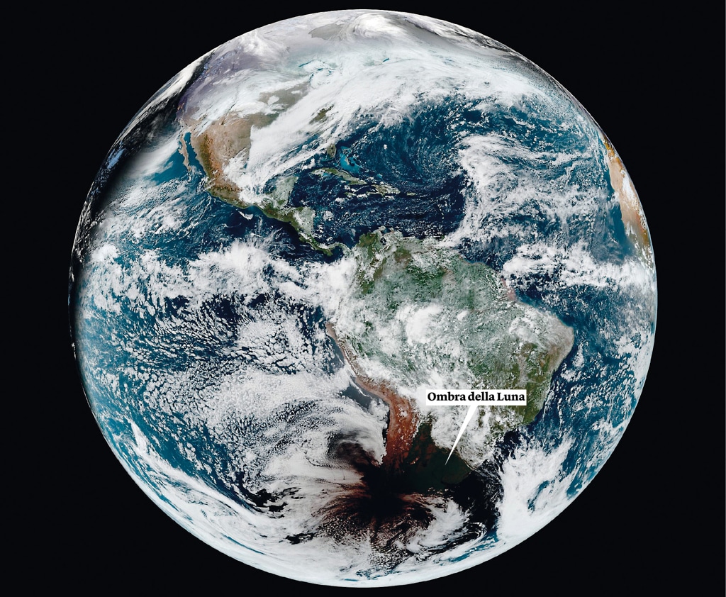 ◆L’unica eclissi solare totale del 2020 si è verificata il 14 dicembre in Argentina e in Cile. Ma a causa della presenza di un fitto strato di nuvole, probabilmente la vista dallo spazio è stata migliore rispetto a quella da terra. Quest’immagine, scattata dal satellite Goes-16 dell’Agenzia oceanica e atmosferica statunitense Noaa, mostra l’ombra della Luna sulla punta meridionale del Sudamerica e su alcune aree dell’oceano Atlantico e di quello Pacifico. Al momento dello scatto il satellite si trovava sull’equatore, a circa 36mila chilometri dalla Terra. L’eclissi ha creato un cono d’ombra nelle aree in cui il Sole era completamente coperto dalla Luna, e un più ampio cono di penombra dove il Sole era solo parzialmente coperto. Nel cono d’ombra, che ha attraversato il continente da Saavedra, in Cile, a Salina del Eye, in Argentina, il Sole è rimasto completamente oscurato per circa due minuti. Le eclissi totali di Sole avvengono in media ogni diciotto mesi, ma vederne una è molto difficile: in una determinata località capita ogni 375 anni. La prossima è prevista il 4 dicembre 2021 in Antartide