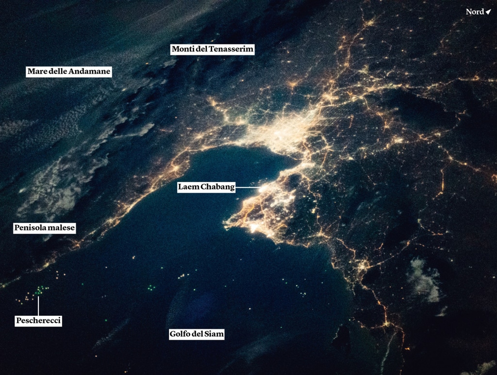 ◆ Quest’immagine notturna, scattata da un astronauta a bordo della Stazione spaziale internazionale (Iss), mostra Bangkok, la capitale e la città più popolosa della Thailandia. Lungo la costa del golfo del Siam sono visibili altre cittadine, tra cui Laem Chabang, il principale porto commerciale del paese. La striscia di terra scura a sinistra nell’immagine è la penisola malese, che separa il golfo del Siam dal mare delle Andamane. Più a nord i monti del Tenasserim, scuri e boscosi, si distinguono dalla pianura circostante.