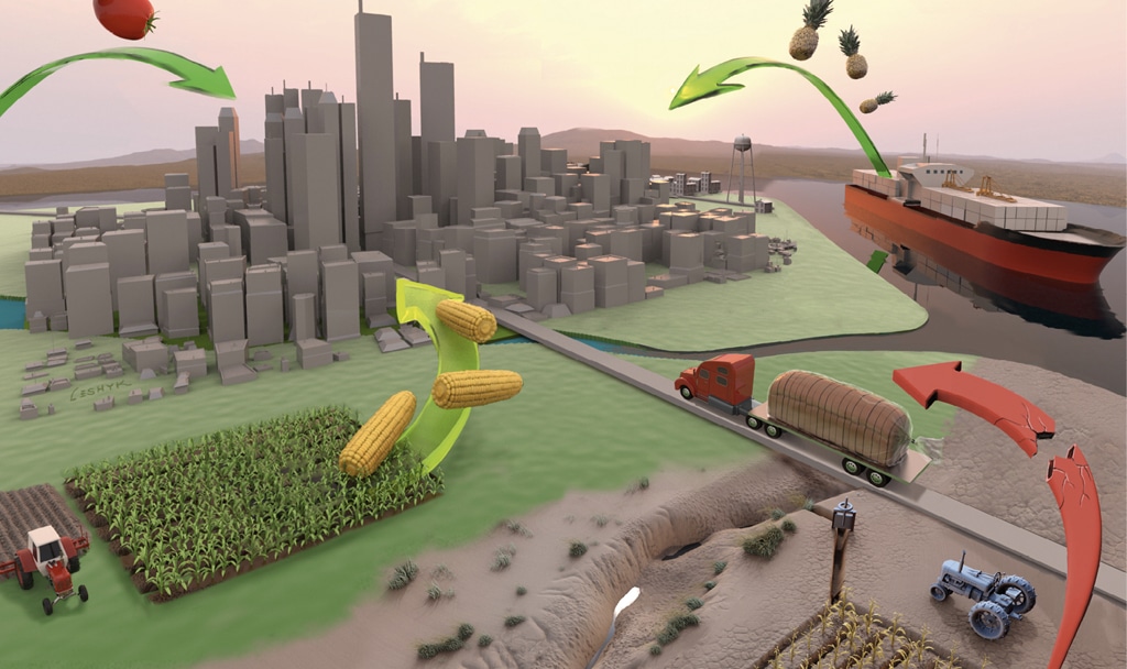 Alimenti I rifornimenti alimentari di un centro urbano potrebbero essere più resistenti ai periodi di crisi diversificando gli approvvigionamenti. La questione si è posta durante la pandemia di covid-19, quando il cambiamento delle abitudini di acquisto e altri fattori hanno pesato sulle disponibilità. Secondo Nature, il problema potrebbe riproporsi a causa di alcuni eventi climatici, come una grave siccità, di crisi finanziarie o di diverse politiche commerciali. Studiando le aree metropolitane degli Stati Uniti, tra il 2012 e il 2015, si è scoperto che le zone più resistenti sono quelle con forniture diversificate. Per esempio, si dovrebbe evitare di importare gli alimenti solo da aree con cui si condividono le condizioni climatiche. Nell’illustrazione, rifornimenti locali e da posti lontani