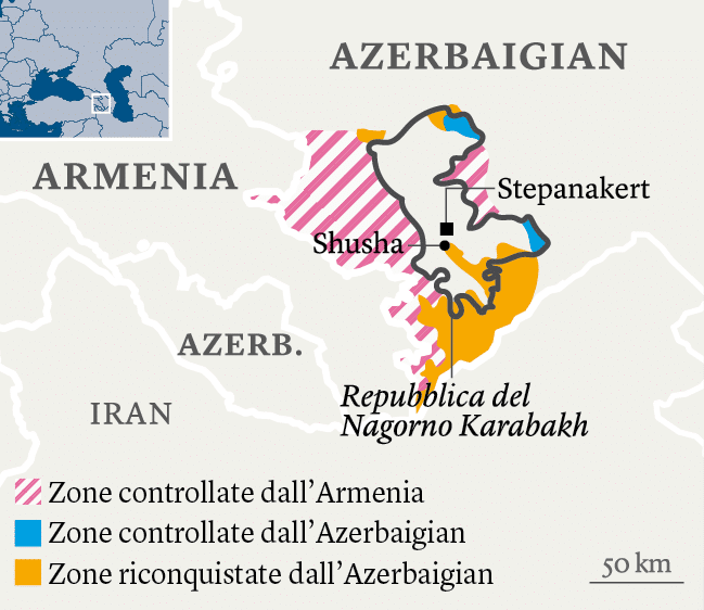 ◆ Dopo sei settimane di combattimenti, il 9 novembre 2020 Armenia e Azerbaigian hanno firmato un accordo che mette fine alla guerra nella regione contesa del Nagorno Karabakh e sancisce di fatto la vittoria militare azera. La tregua è stata raggiunta grazie alle mediazione del presidente russo Vladimir Putin, che invierà nella regione duemila soldati per assicurare il rispetto degli accordi. In base all’intesa, l’Azerbaigian prenderà il controllo di alcuni territori all’interno della repubblica filoarmena del Nagorno Karabakh e di buona parte delle aree che la circondano e che erano occupate dall’Armenia dal conflitto del 1994.