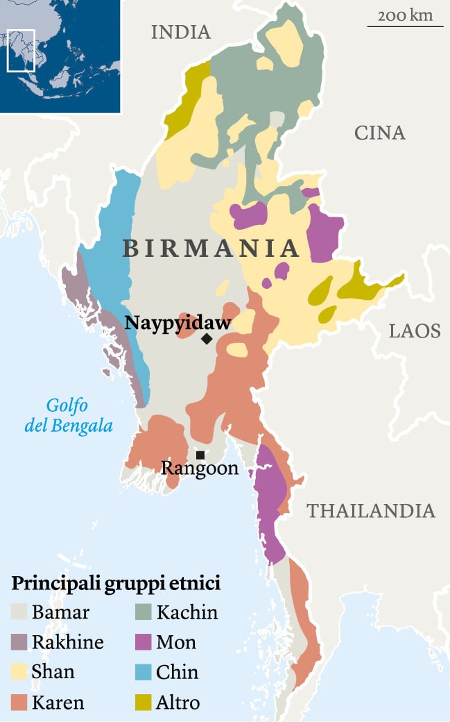 ◆ Il 1 febbraio 2021 l’esercito guidato dal generale Min Aung Hlaing ha deposto con un colpo di stato il governo di Aung San Suu Kyi, con cui i militari condividevano il potere dal 2016. Nel novembre 2020 il partito di Suu Kyi, la Lega nazionale per la democrazia (Lnd), aveva trionfato alle elezioni ma i generali rifiutavano l’esito del voto, denunciando brogli e irregolarità. La giunta che si è installata al governo ha promesso di indire elezioni entro un anno. La popolazione ha risposto scendendo in piazza ogni giorno in tutte le città e un grande movimento di disobbedienza civile ha paralizzato il paese. Le forze armate hanno reagito sparando contro i manifestanti. L’8 giugno, secondo i dati dell’Associazione di assistenza ai prigionieri politici birmana, le vittime erano 857, gli arrestati 4.704.