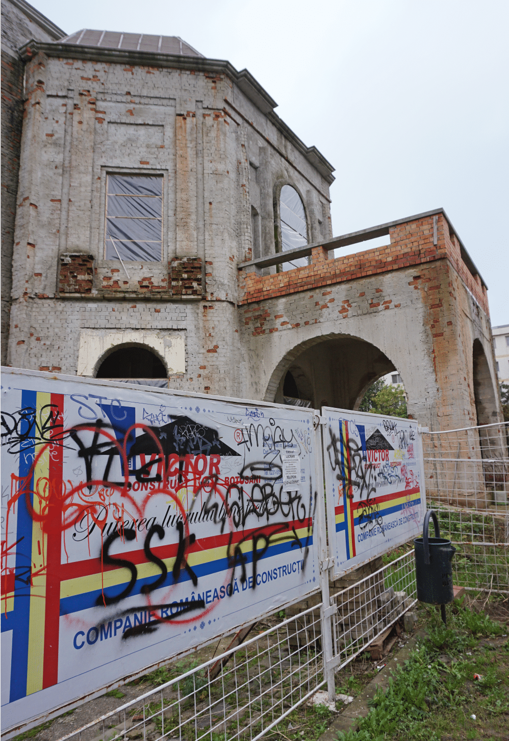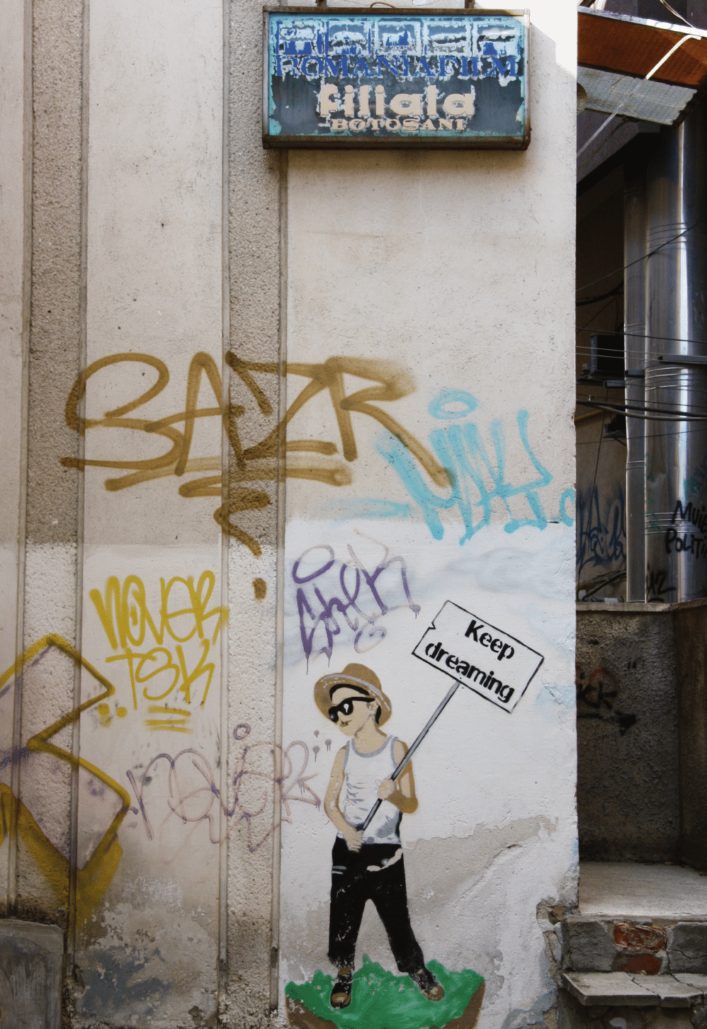 Gli spazi per i giovani sono pochi. Tra questi un bar chiamato Facefood, scritto con la stessa grafica del logo di Facebook, molto popolare tra gli studenti. Su una via laterale, accanto a un cinema ormai chiuso, un murale mostra un bambino che tiene in mano un cartello con la scritta Keep dreaming, continua a sognare. Poco distanti ci sono il municipio e l’edificio che ospita il consiglio distrettuale, la prefettura e il teatro Mihai Eminescu, un tempo il cuore culturale della città, ora in restauro. La cupola del teatro e la sua imponente facciata in stile neoclassico sono state sventrate. Davanti s’innalza un piedistallo fin troppo alto, con la statua del figlio più celebre della città, il poeta Eminescu, raffigurato con gli occhi chiusi. Una striscia blu, risultato dell’ossidazione del metallo, attraversa la statua dal viso al petto.
