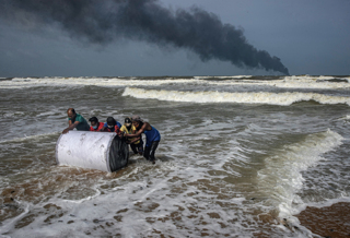 Alcune persone sulla spiaggia di Colombo recuperano un rottame proveniente dalla nave portacontainer che ha preso fuoco di fronte alla costa, dov’era ancorata in attesa… Leggi