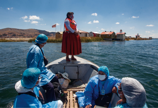 La mediatrice interculturale Rita Subana, ex sindaca delle Isole galleggianti degli uros, a bordo di una barca sul lago Titicaca con alcuni impiegati del ministero della sanità… Leggi